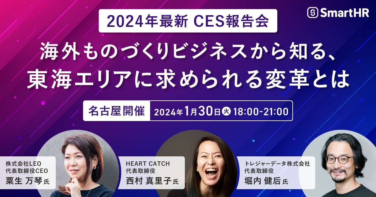 本セミナーでは、2024年1月上旬にラスベガスで開催される米国テクノロジー見本市CES(Consumer Electronics Show)を参考に、海外のDX動向や人事総務DXについてご紹介いたします。セミナー終了後には、登壇者を含めた懇親会のお時間もご用意しています。最新のテクノロジー動向に関する情報収集や経営者同士の交流の場としてぜひご活用ください。