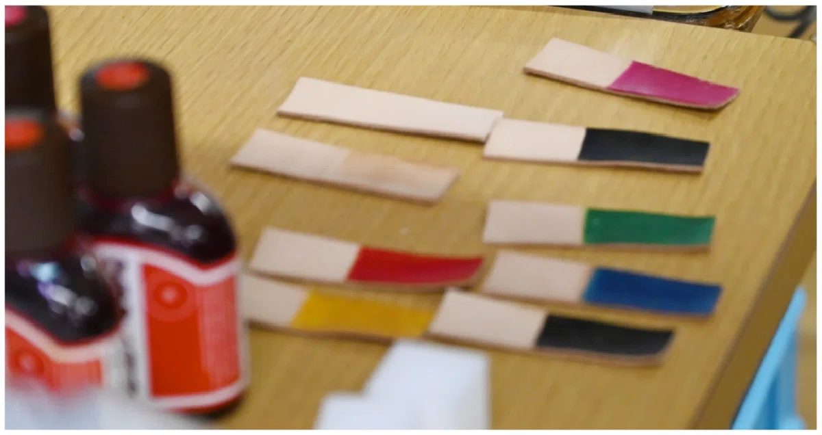 ヌメ革をオイル染料で自分の好きな色に染めて、ホックで留めてキーホルダーにします。