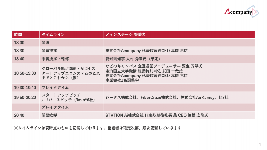 - AICHIスタートアップエコシステム大交流会運営事務局(STATION Ai株式会社、なごのキャンパス、株式会社Acompany)