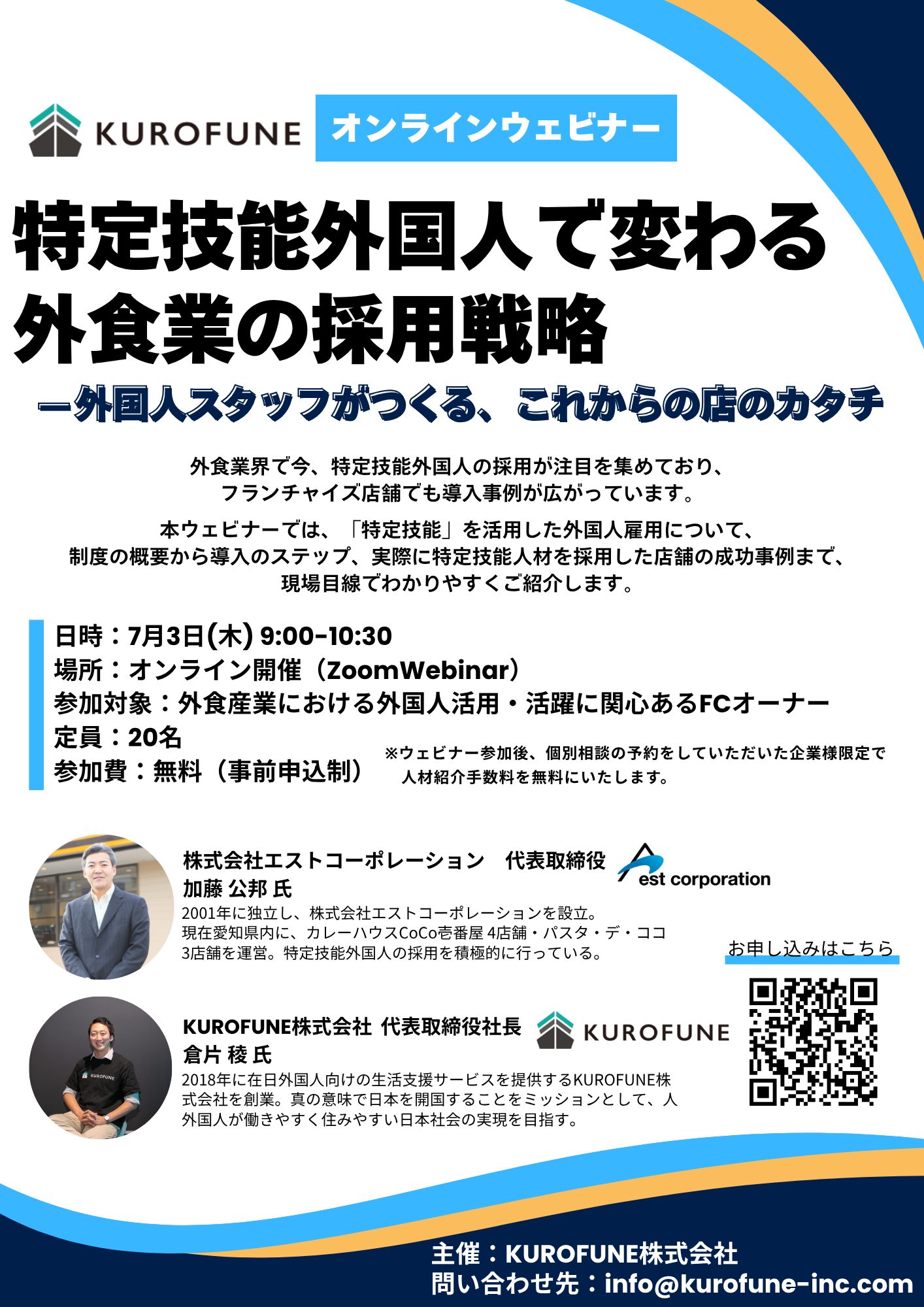 フランチャイズ店舗や飲食店のオーナー様を対象に、特定技能外国人の雇用により人手不足を解消した事例や導入のステップ、成功のポイントなどをご紹介し、より具体的な導入イメージ深めていただける内容となっております。