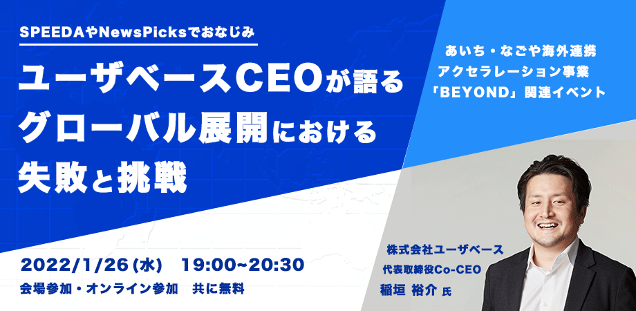 愛知県出身の創業者であり、現在は代表取締役Co-CEOである稲垣 裕介 氏をお迎えし、これまでのグローバル展開の事例と、失敗もありながらも「なぜ挑戦し続けるのか?」を具体的な事例も交えてお話しいただきます。