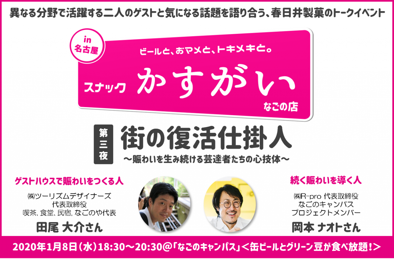 好奇心旺盛な大人たちが、ビールとグリーン豆をお供に、気になる人の気になる話を聞いて楽しむ社交場、それが「スナックかすがい」です。 なごの店第三夜のテーマは「街の復活仕掛人~賑わいを生み続ける芸達者たちの心技体~」! 街の復活仕掛け人として活躍するお二人をお招きします。