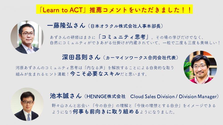 まだまだ自分の可能性はこんなものじゃない、もっとできるのではないだろうか?と自分自身に対する期待と可能性を感じている皆さんの「自分への認識」を変えるきっかけになるのが、【Learn to ACT】です。ぜひ、ご期待ください!