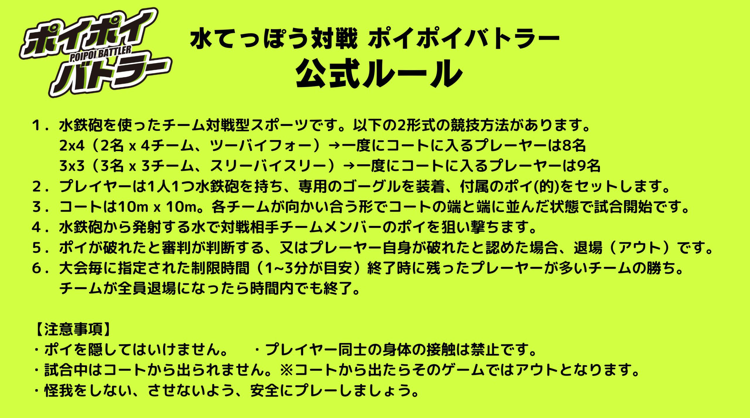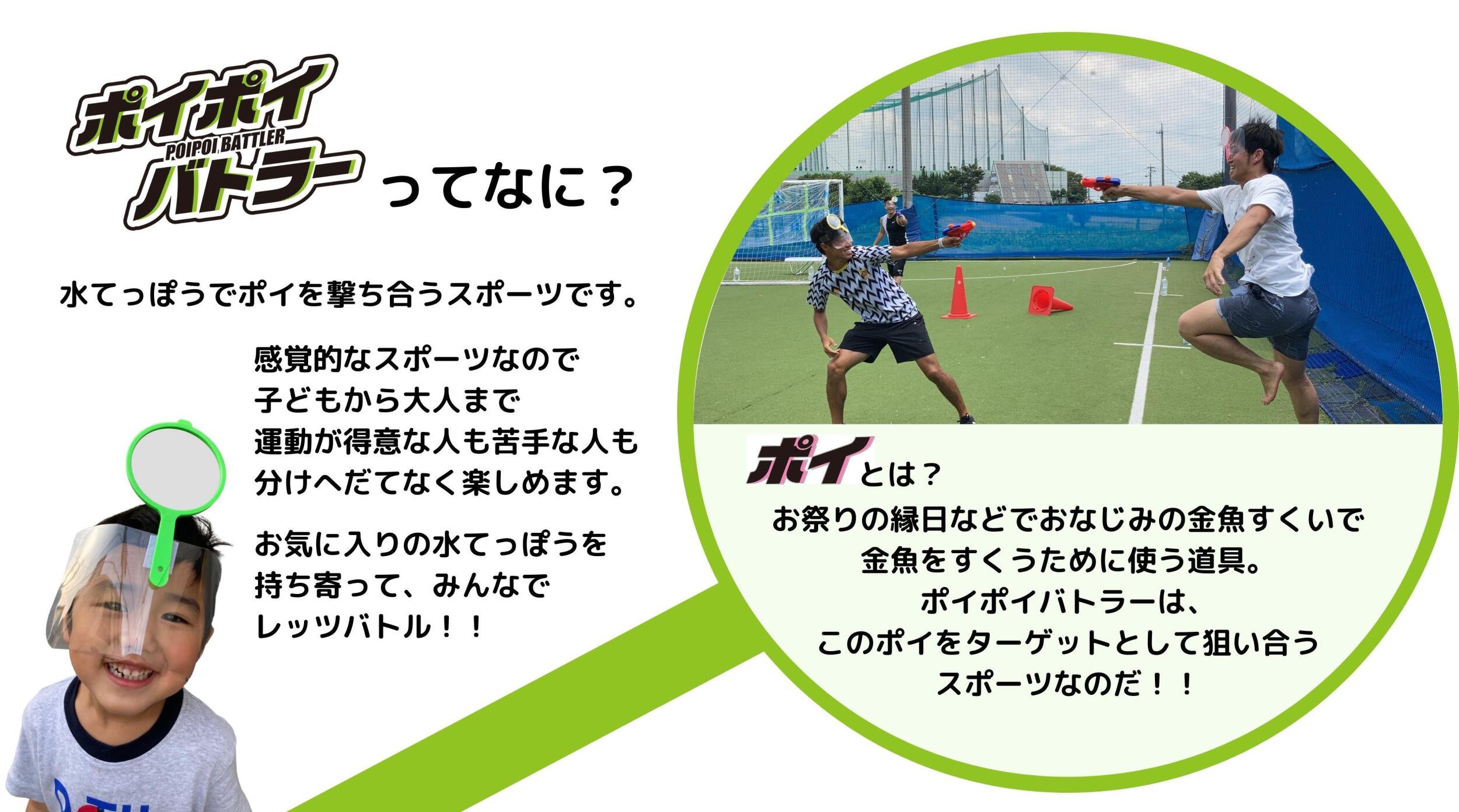 親子タッグで勝利をつかめ! 水鉄砲で安全に対戦が楽しめる新スポーツ「ポイポイバトラー」を、2名 x 4組同時対戦のタッグバトルロワイアル形式で開催します。