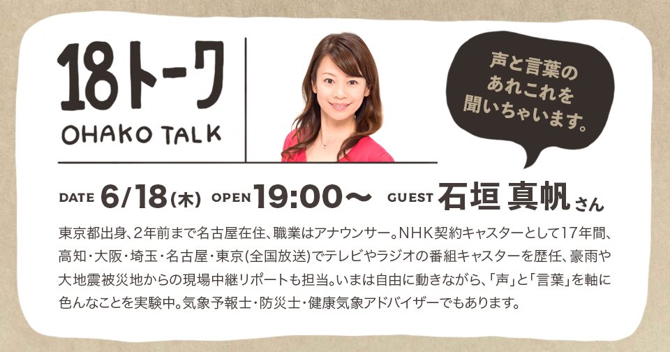 R-proがゲストをお迎えしてライブ配信でお届けする「18トーク(OHAKO TALK)」第六回目のゲストは、アナウンサーとしてキャリアを重ねられ、現在はそれを生かした声と言葉を軸に色々と挑戦中の石垣 真帆さん!私たちが何気なく使っている声や言葉のあれこれを、代表の岡本ナオトがお聴きしていきます!