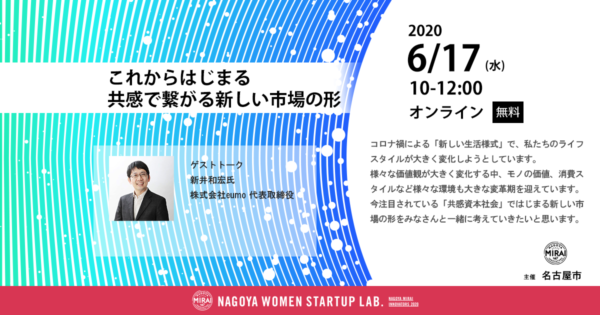 【なごやみらい企業創出プロジェクト NAGOYA WOMEN STARTUP LAB.オープンセミナー】6/17:これからはじまる、共感で繋がる新しい市場の形【ゲスト】新井和宏氏