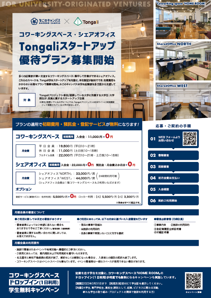 Tongali学生スタートアップを対象に、コワーキングスペース・シェアオフィスをお得にご利用できるプランを開始いたしました。